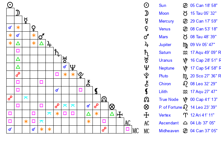 | Moon | 14 Taurus 57 | 22 Cancer 20 | 5 Leo 14 |