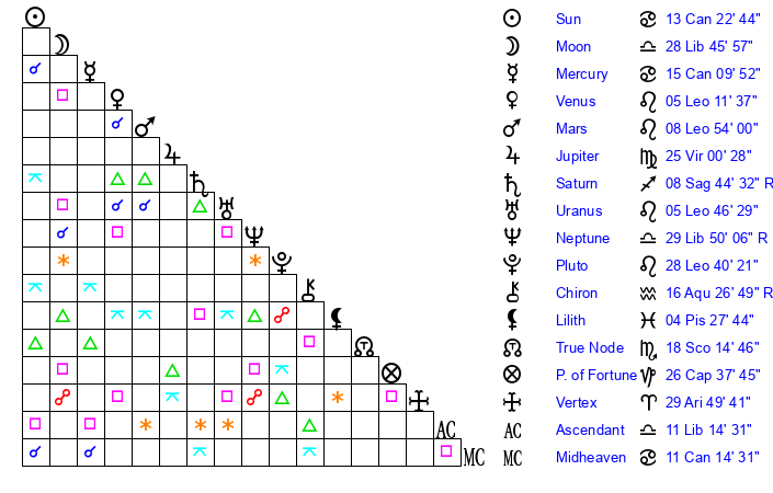 | Sun | 13 Cancer 23 | 13 Cancer 55 | 18 Virgo 40 |