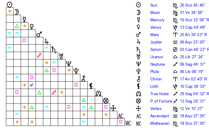 | Sun | 26 Scorpio 46 | 27 Scorpio 9 | 19 Capricorn 37 |