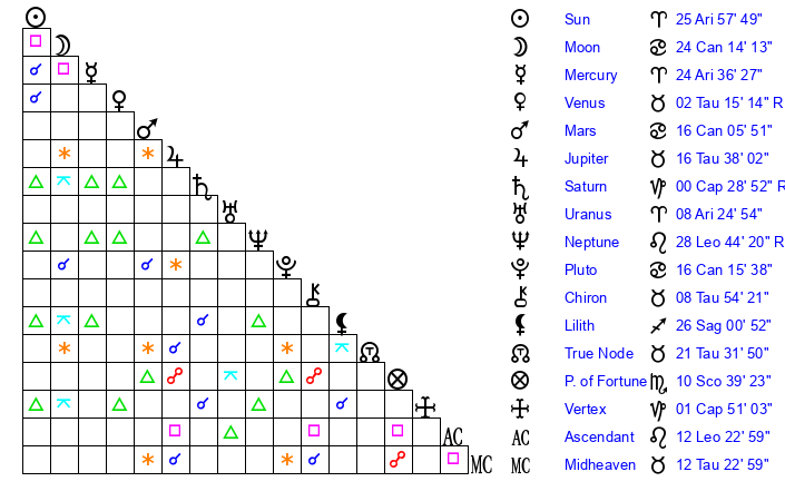 | Sun | 25 Aries 58 | 26 Aries 42 | 28 Cancer 10 |