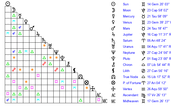 | Venus | 23 Gemini 39 | 28 Aries 32 | 11 Gemini 49 |
