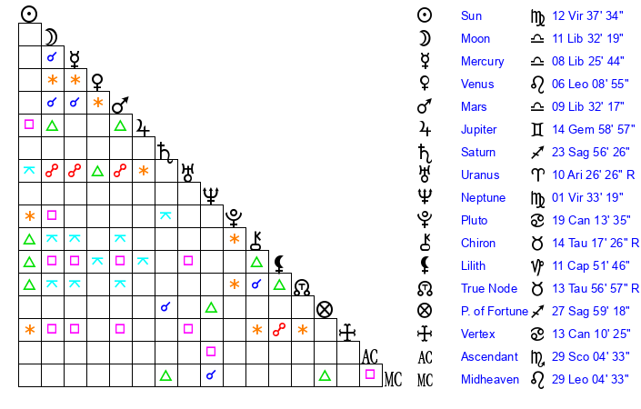 | Sun | 12 Virgo 37 | 13 Virgo 23 | 18 Sagittarius 10 |