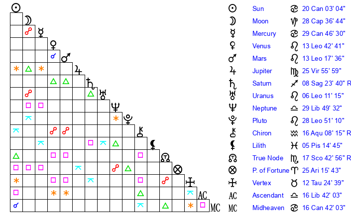 | Moon | 28 Capricorn 31 | 12 Aquarius 59 | 14 Cancer 49 |