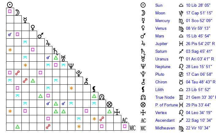 | Sun | 10 Libra 28 | 11 Libra 43 | 19 Capricorn 14 |