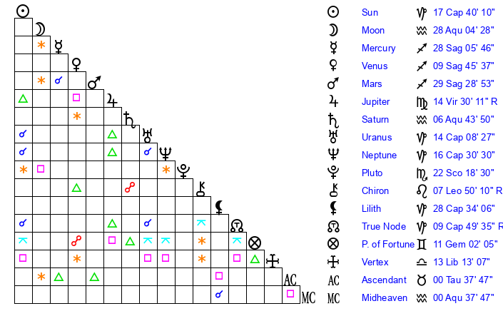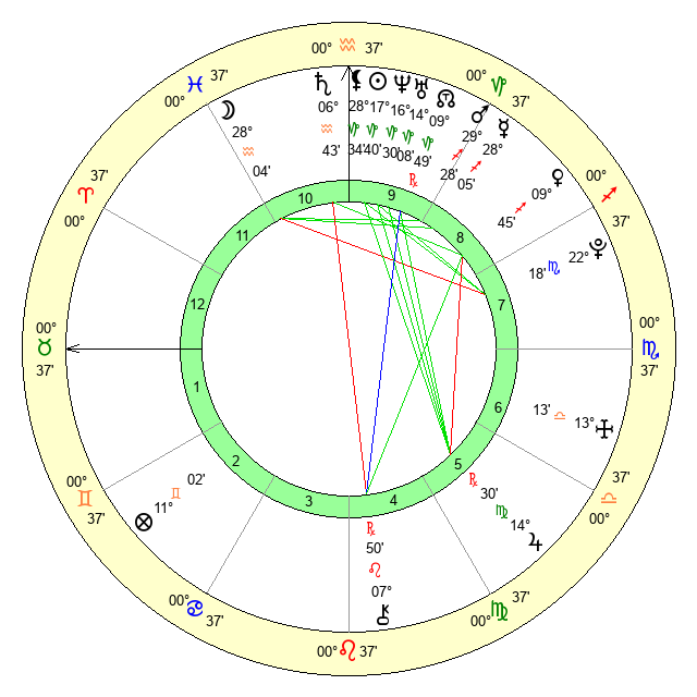| Moon | 28 Aquarius 4 | 11 Taurus 11 | 9 Taurus 25 |