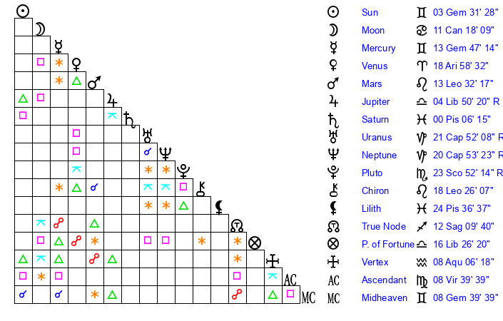| Sun | 3 Gemini 31 | 3 Gemini 46 | 4 Cancer 8 |