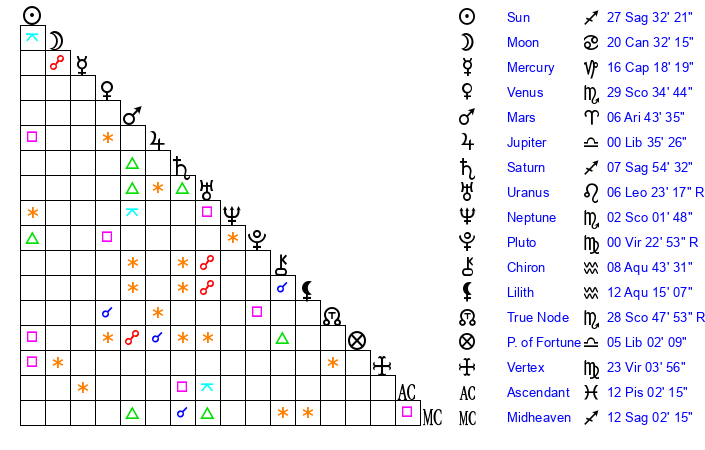 Pluto | 0 Virgo 22 | 0 Aquarius 41 | 29 Leo 0 |