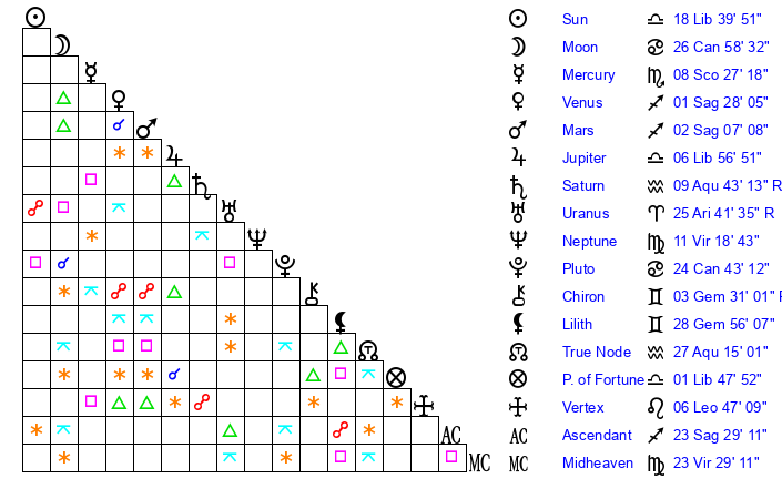 | Moon | 26 Cancer 59 | 2 Cancer 25 | 7 Sagittarius 53 |