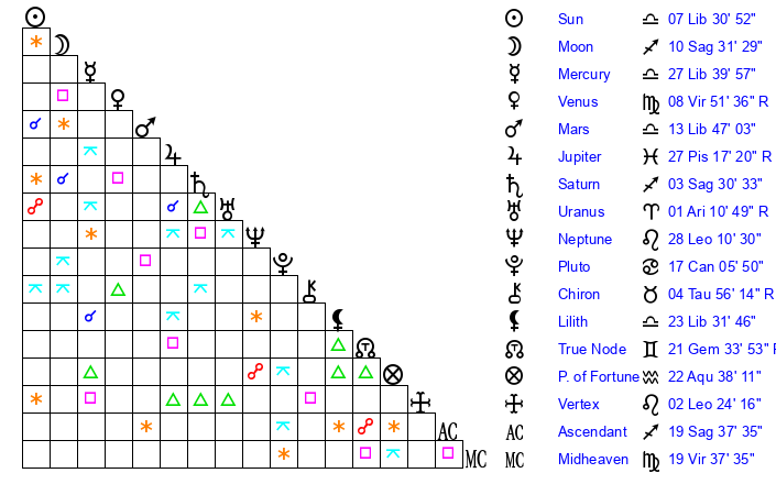 | Sun | 7 Libra 31 | 8 Libra 46 | 16 Capricorn 10 |
