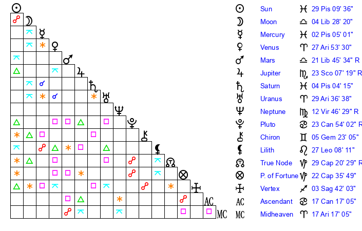 | Sun | 29 Pisces 9 | 0 Aries 20 | 26 Gemini 31 |