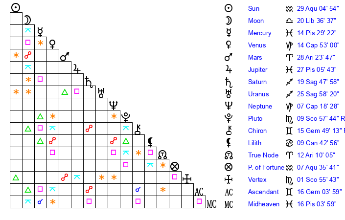 | Moon | 20 Libra 37 | 3 Scorpio 8 | 21 Pisces 12 |