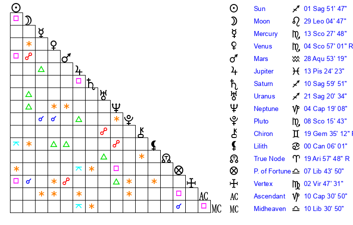 | Uranus | 21 Sagittarius 22 | 24 Taurus 57 | 23 Sagittarius 39 |
