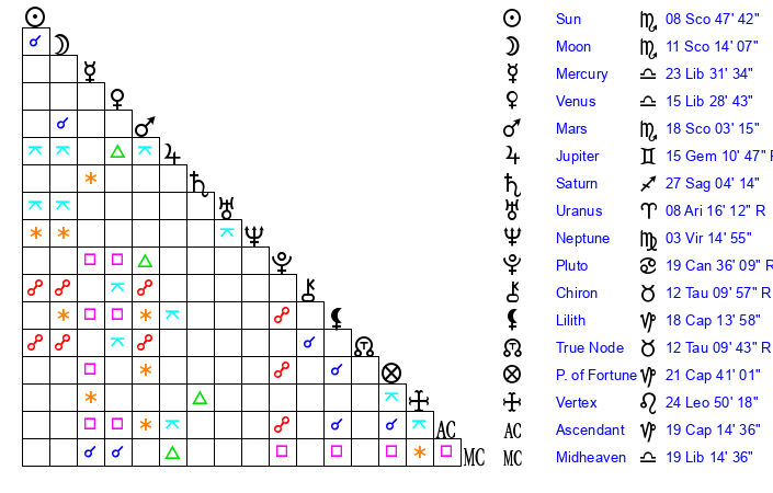 | Moon | 11 Scorpio 8 | 16 Pisces 41 | 3 Taurus 54 |
