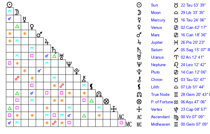 | Moon | 29 Libra 34 | 16 Sagittarius 18 | 7 Gemini 51 |