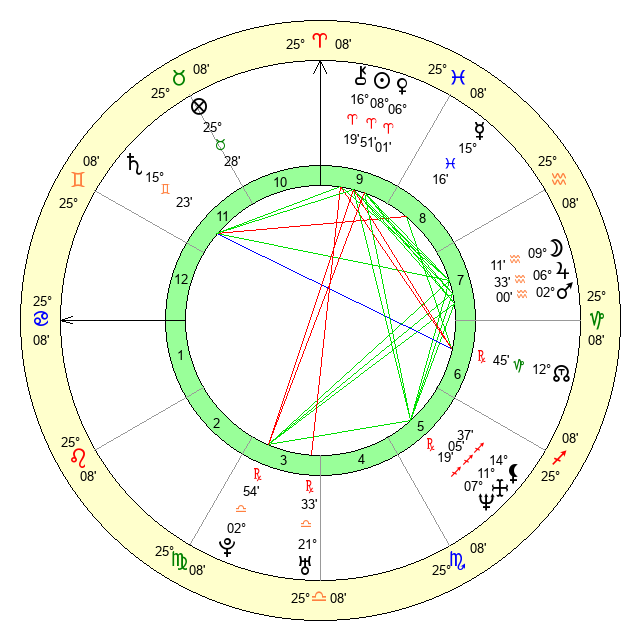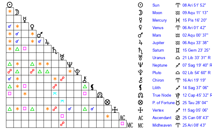 | Saturn | 15 Gemini 41 | 24 Pisces 8 | 21 Gemini 6 |