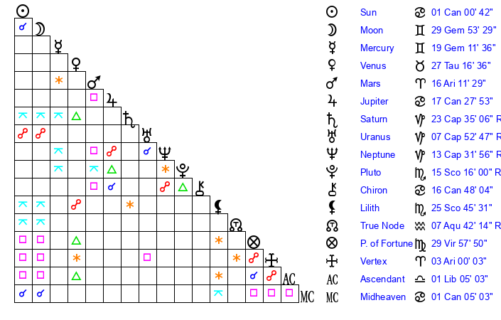 | Mercury | 19 Gemini 12 | 24 Cancer 17 | 27 Leo 24 |