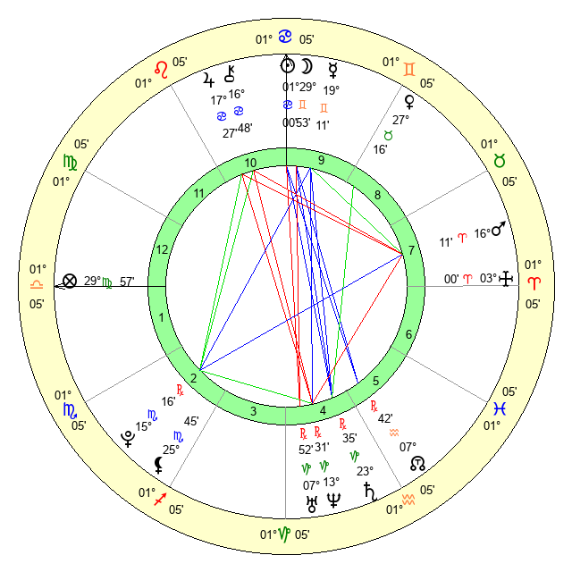 | Sun | 1 Cancer 0 | 1 Cancer 31 | 4 Leo 24 |