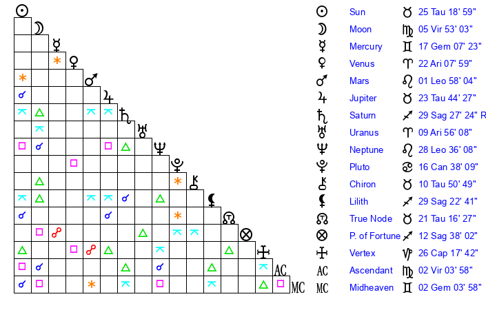| Mercury | 17 Gemini 7 | 11 Taurus 4 | 15 Virgo 40 |