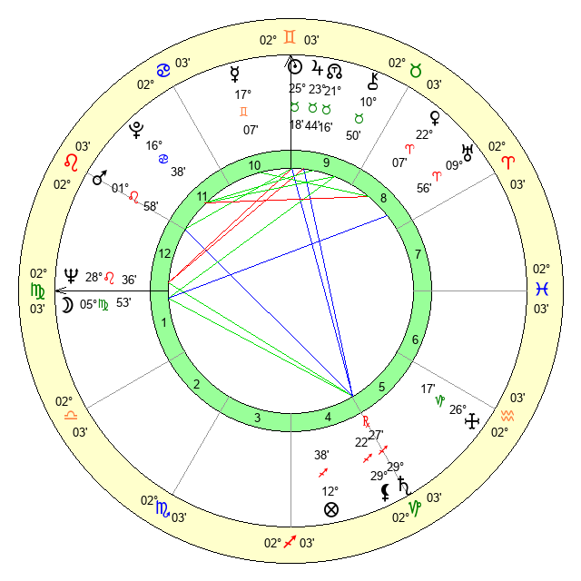 | Moon | 6 Virgo 0 | 10 Capricorn 50 | 0 Pisces 44 |
