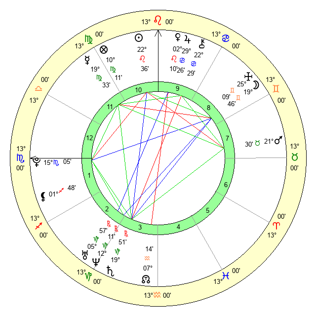 | Mercury | 19 Virgo 33 | 5 Leo 23 | 9 Virgo 58 |