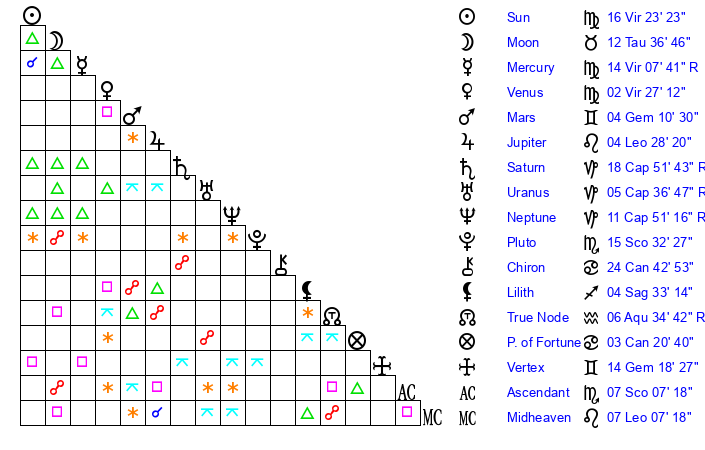 Moon | 12 Taurus 26 | 7 Aries 57 | 0 Virgo 13 |