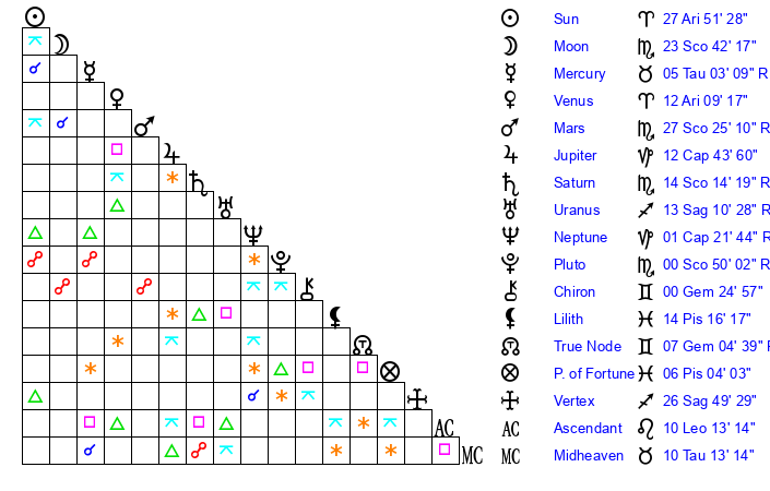 | Moon | 23 Scorpio 40 | 19 Sagittarius 7 | 13 Taurus 53 |