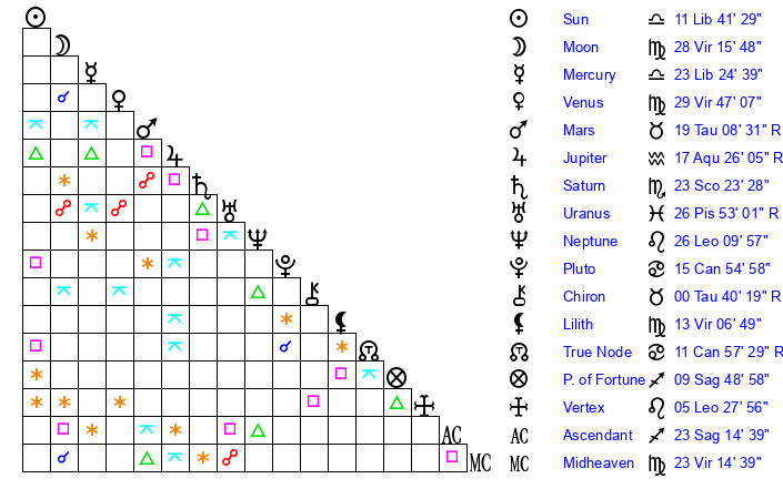 | Moon | 28 Virgo 19 | 22 Pisces 50 | 18 Taurus 28 |