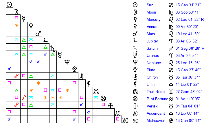 | Pluto | 15 Cancer 28 | 2 Aquarius 57 | 17 Cancer 10 |