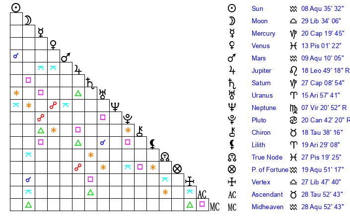 | Moon | 29 Libra 29 | 12 Aquarius 20 | 27 Pisces 3 |