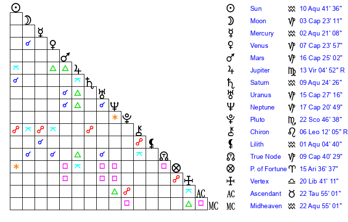 | Neptune | 17 Capricorn 21 | 27 Pisces 56 | 18 Capricorn 21 |