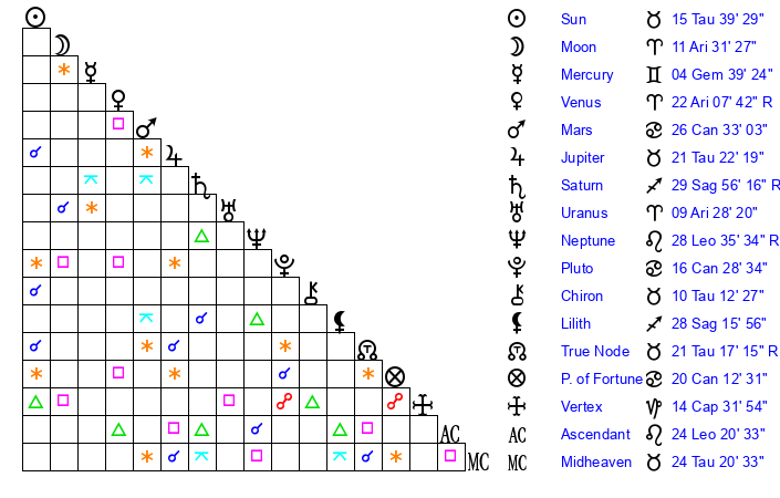 | Sun | 15 Taurus 40 | 16 Taurus 25 | 17 Leo 33 |