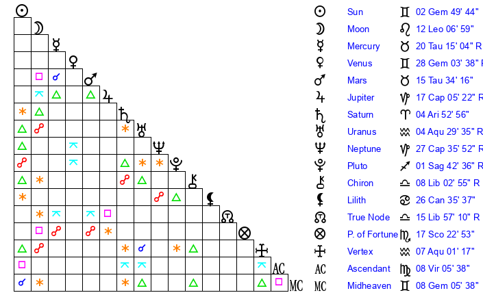 | Venus | 28 Gemini 3 | 17 Aries 14 | 13 Gemini 58 |