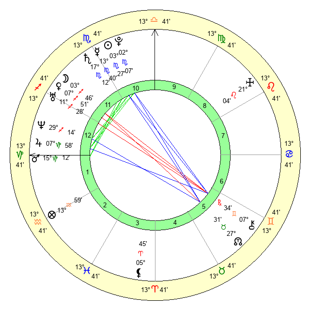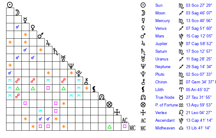 | Saturn | 17 Scorpio 30 | 25 Pisces 57 | 22 Scorpio 20 |