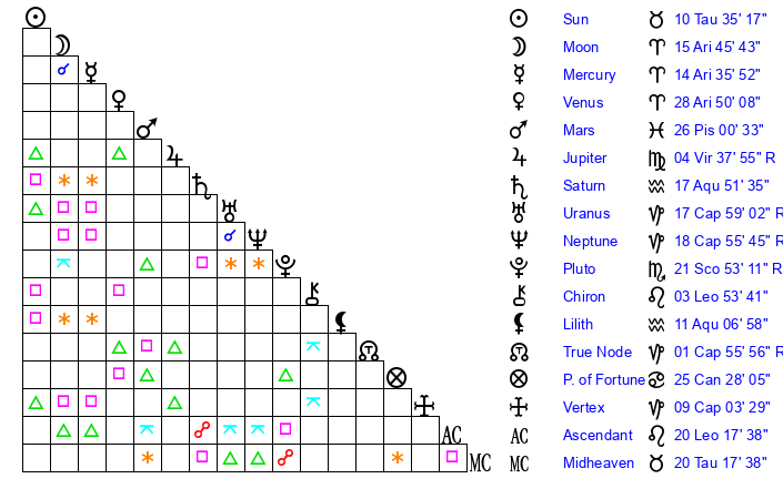 | Saturn | 17 Aquarius 48 | 27 Pisces 44 | 18 Aquarius 24 |