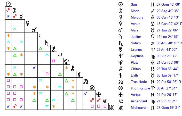 | Sun | 27 Gemini 12 | 27 Gemini 42 | 26 Virgo 31 |
