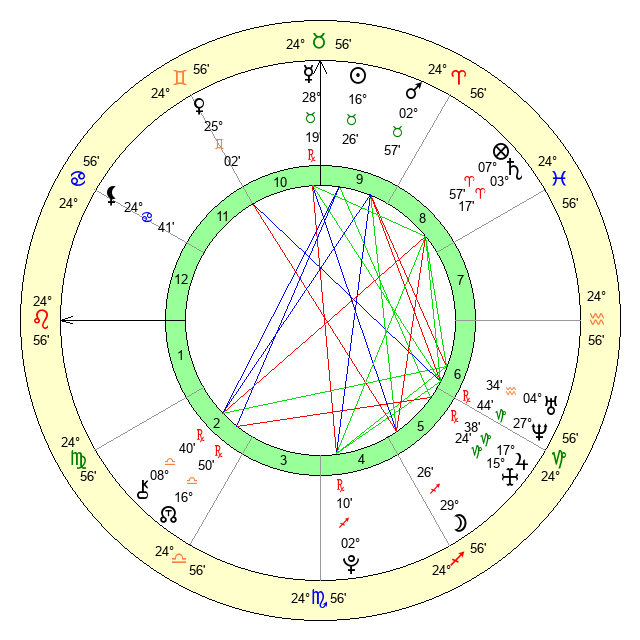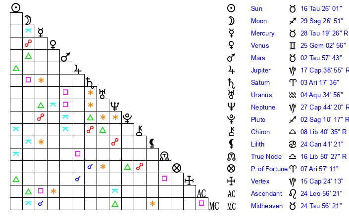 | Mars | 2 Taurus 58 | 8 Leo 16 | 24 Taurus 19 |