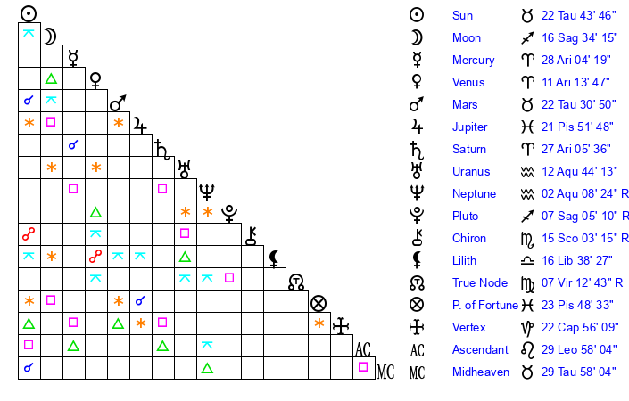 | Uranus | 12 Aquarius 44 | 27 Taurus 4 | 12 Aquarius 31 |