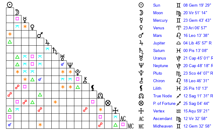 | Moon | 20 Virgo 55 | 14 Cancer 10 | 27 Scorpio 57 |