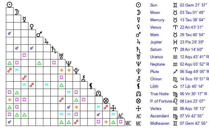 | Neptune | 2 Aquarius 3 | 1 Aries 42 | 1 Aquarius 37 |