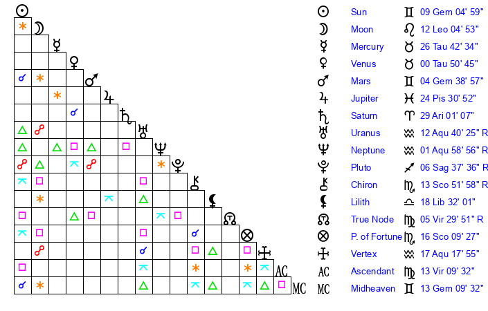 | Sun | 9 Gemini 5 | 9 Gemini 32 | 4 Cancer 53 |