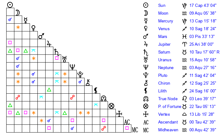 | Sun | 17 Capricorn 43 | 18 Capricorn 40 | 13 Aquarius 9 |