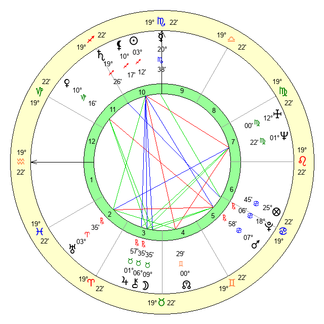 | Moon | 9 Taurus 38 | 3 Aquarius 30 | 3 Sagittarius 20 |