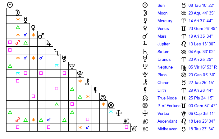 | Moon | 20 Aquarius 46 | 21 Taurus 28 | 4 Cancer 38 |