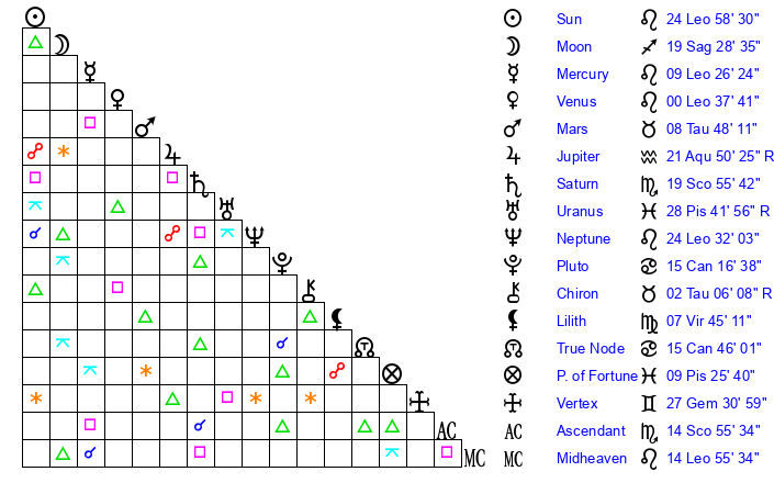 | Sun | 24 Leo 58 | 26 Leo 0 | 2 Sagittarius 41 |