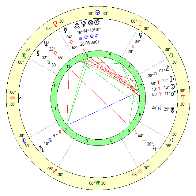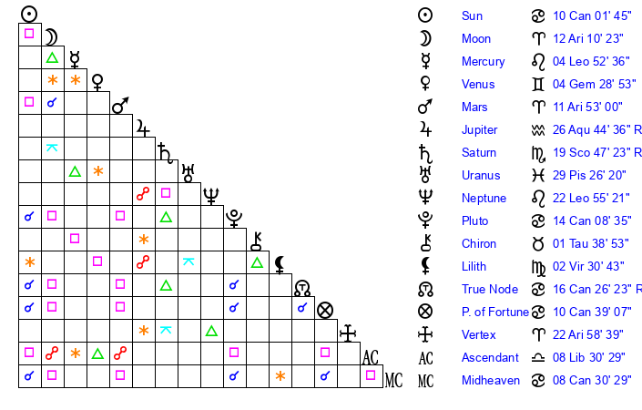 | Moon | 12 Aries 10 | 9 Libra 59 | 17 Scorpio 6 |