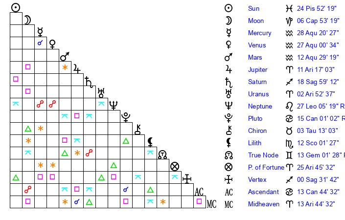 | Sun | 24 Pisces 53 | 25 Pisces 22 | 29 Gemini 5 |