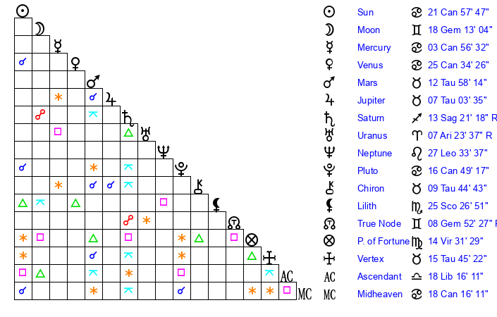 | Moon | 18 Gemini 12 | 9 Pisces 42 | 2 Capricorn 4 |