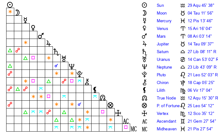 | Sun | 29 Aquarius 45 | 0 Pisces 17 | 11 Taurus 0 |