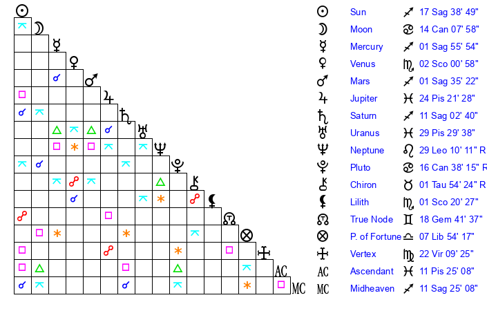 | Saturn | 11 Sagittarius 25 | 25 Pisces 12 | 19 Sagittarius 24 |