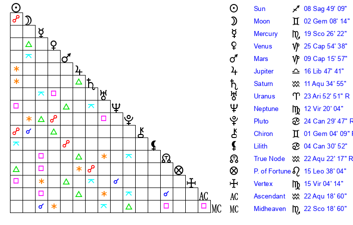 | Sun | 8 Sagittarius 49 | 9 Sagittarius 30 | 12 Pisces 11 |